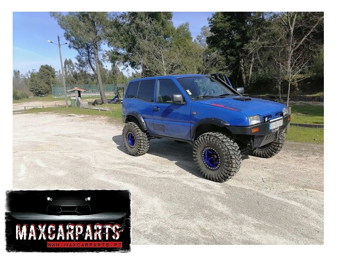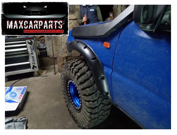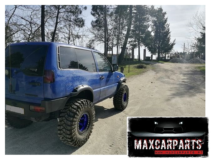 Kit especifico para Nissan Terrano II 3 Portas. Este kit é feito para utilização de pneus de grandes dimensões, sendo assim necessário fazer uma adaptação na chapa dos guarda lamas durante a montagem, isto de forma a ter mais espaço para pneus maiores. Fazem acabamento com parachoques originais de plástico, mas a sua montagem, tambèm poderá ser feita com outros modelos de para-choques em ferro.