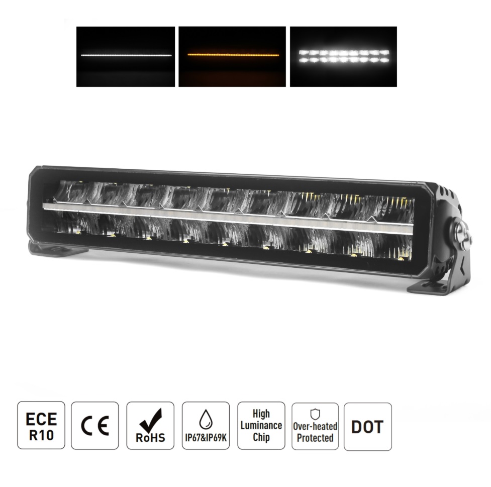 Barra com leds Osram, certificação e com três funções de iluminação, mínimos DRL branco, Piscas DRL laranja e máximos brancos.