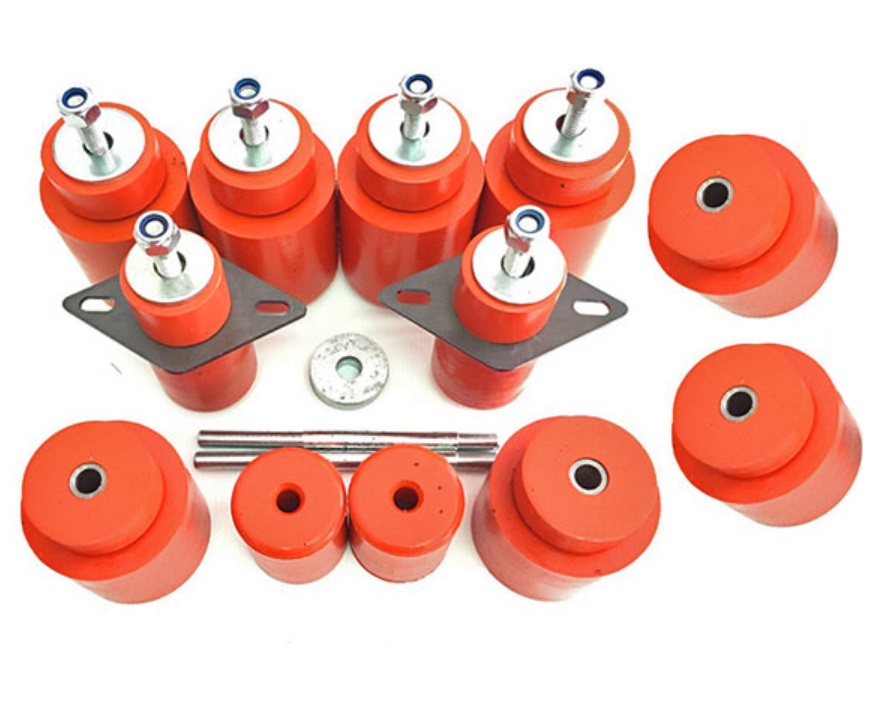 Conjunto de peças de suspensão automóvel em borracha laranja e metal prateado