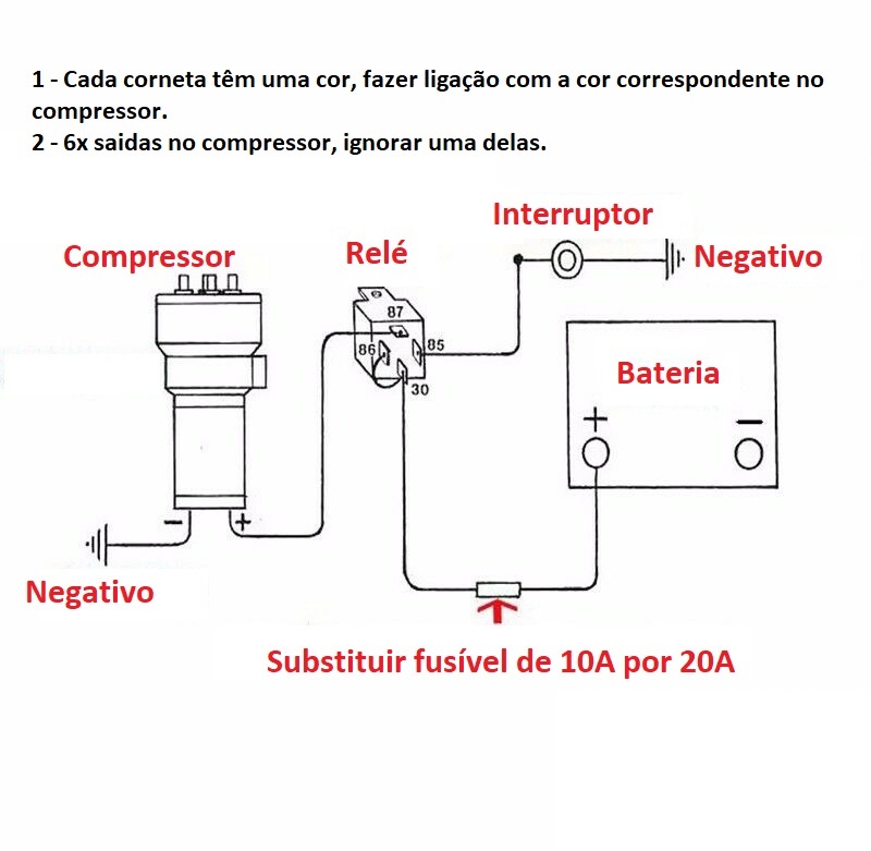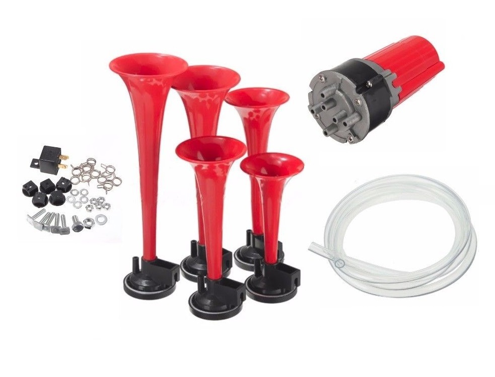 Buzinas a Ar com mini compressor incluído, funcionamento a 12V, feitas em plástico.