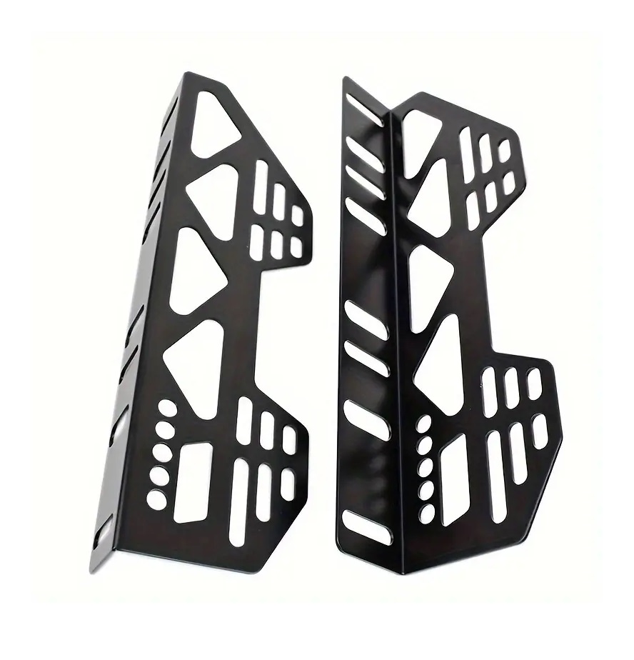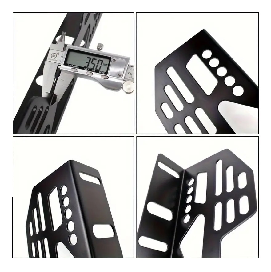Suporte de metal preto com múltiplas aberturas, mostrado em várias vistas