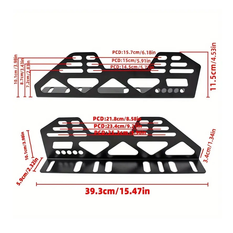Suporte metálico preto com medições em vermelho sobre fundo branco