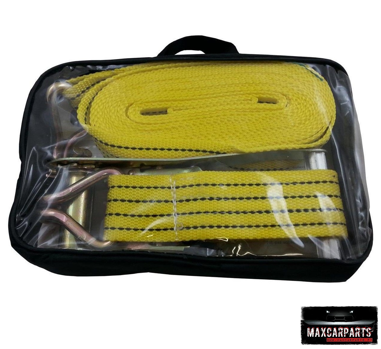 Cinta de elevação amarela com riscas pretas e manípulo metálico com pega preta, com etiqueta MAXCARPARTS