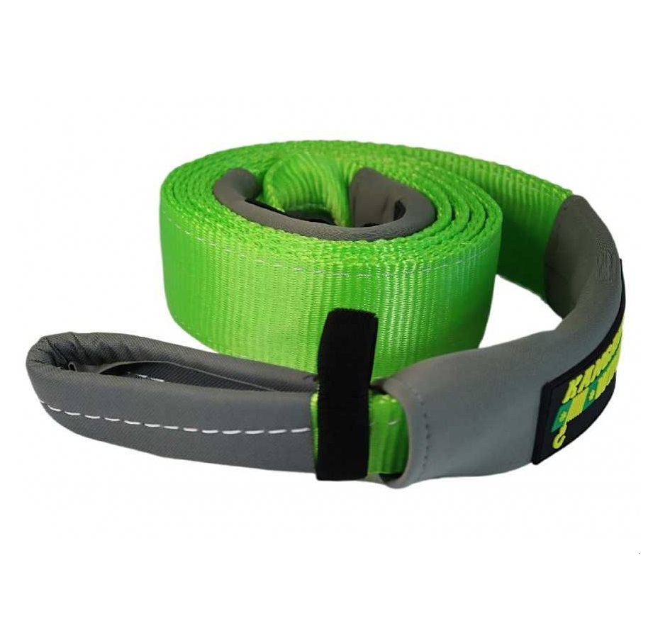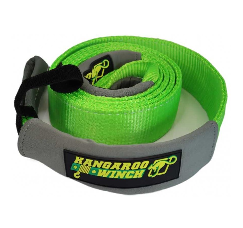 Correia de reboque verde fluorescente com proteção cinzenta e etiqueta KANGAROO WINCH