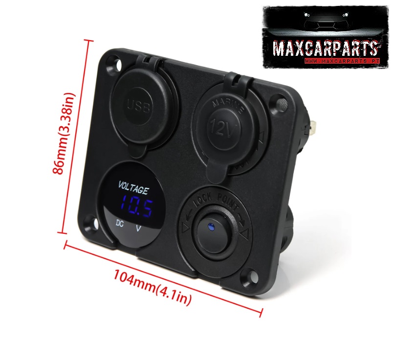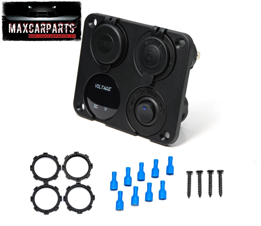 Paínel de alumínio com 1 interruptores ON-OFF + fichas USB + manómetro Voltímetro + carregador de isqueiro.