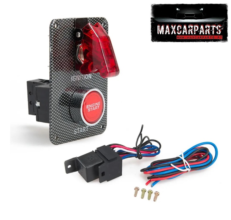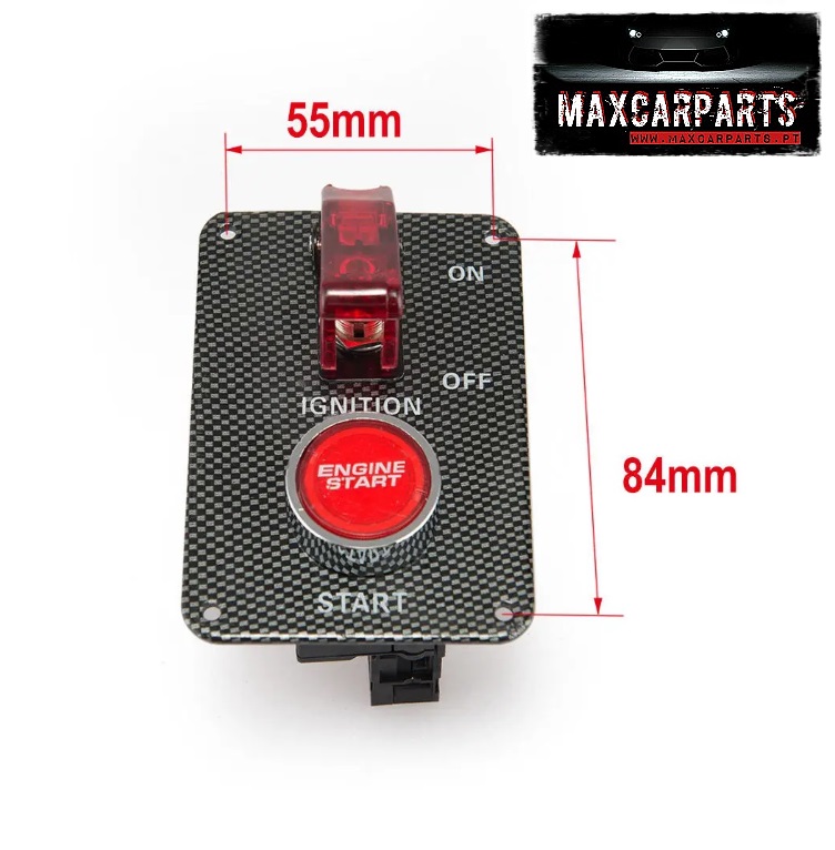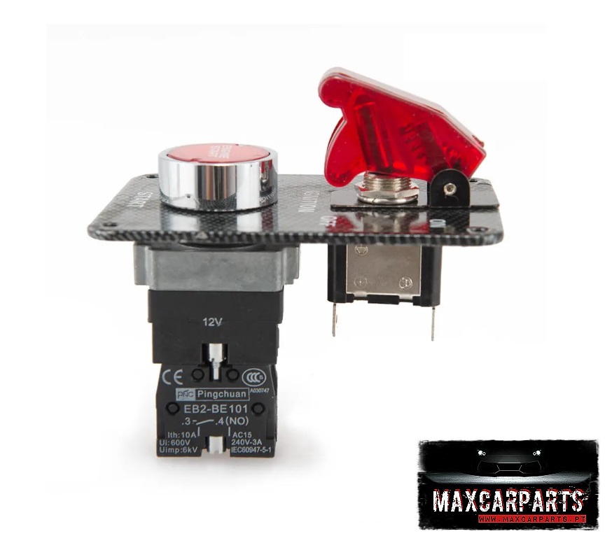 Painel com botão cromado e interruptor com capa vermelha transparente em base preta com texto e selo MAXCARPARTS