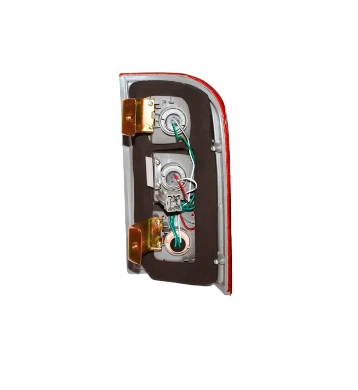 Luz traseira de automóvel vista por trás com fios e elementos metálicos