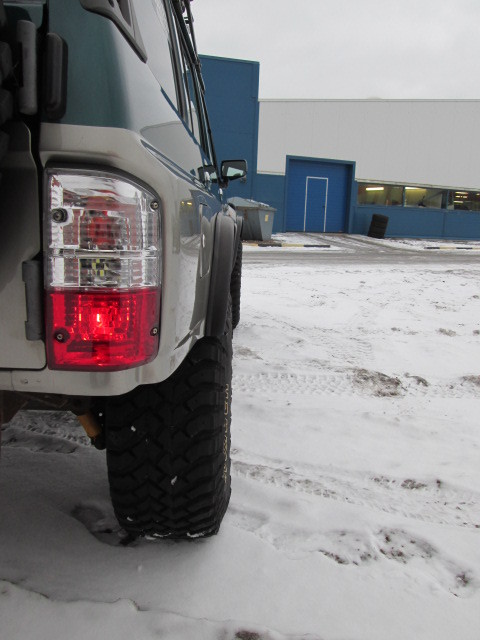 Traseira de veículo todo-o-terreno cinza em chão com neve e edifício azul ao fundo