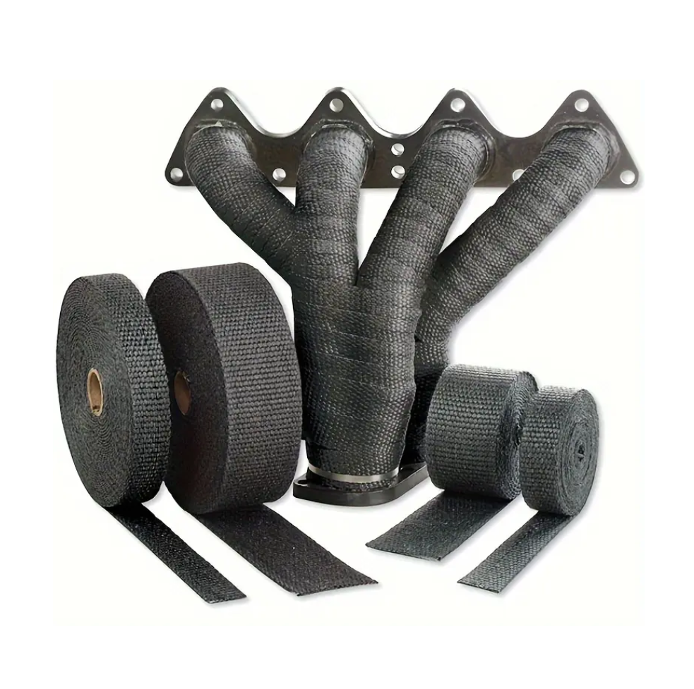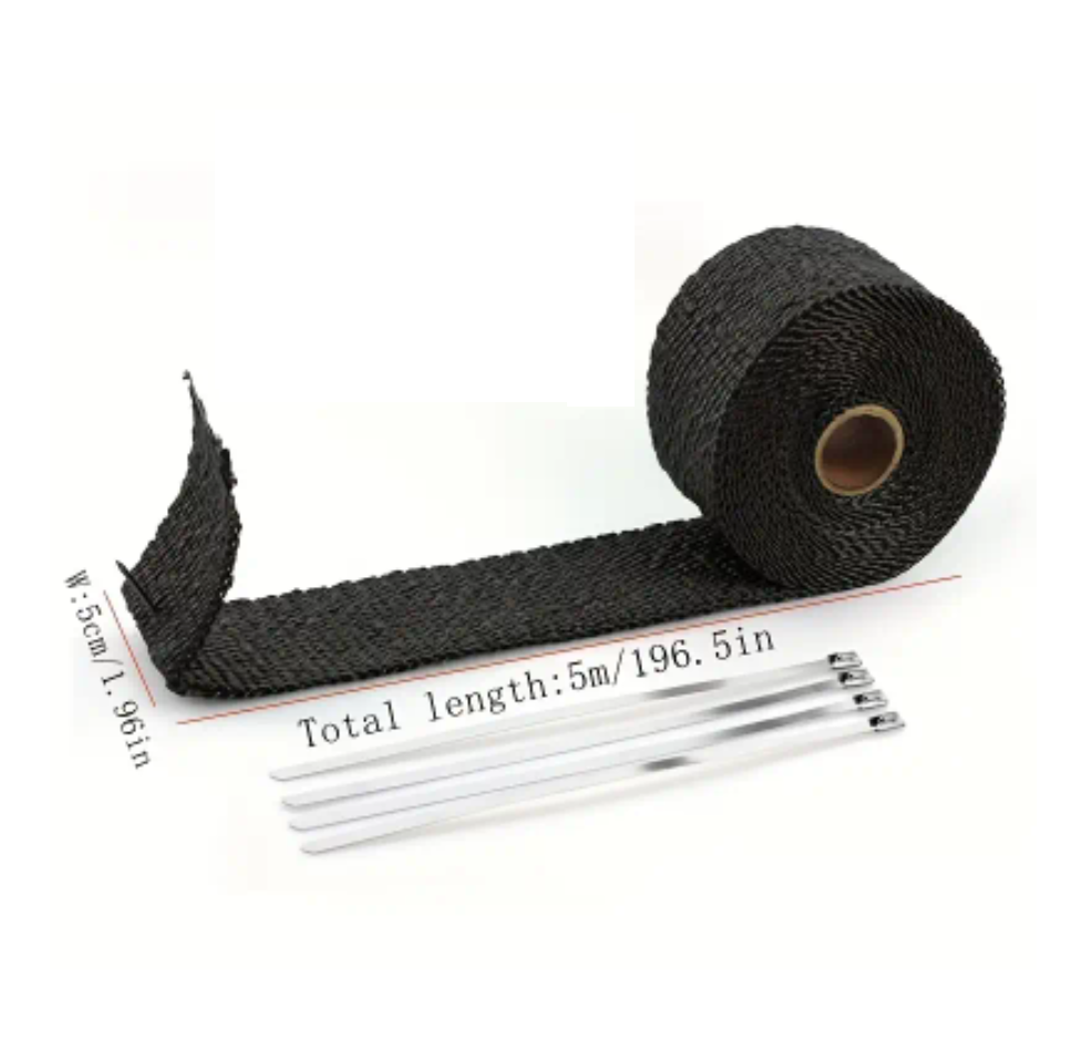 Coletor de escape com fita térmica preta e três rolos de fita térmica preta.