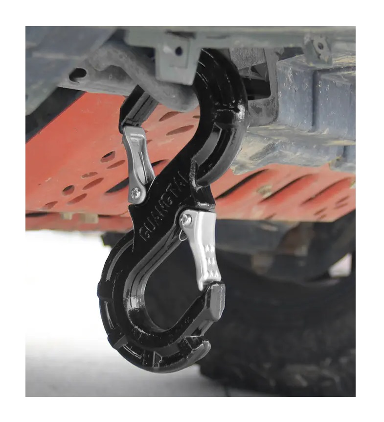 Gancho duplo de metal preto e prateado em detalhe na parte traseira de um veículo