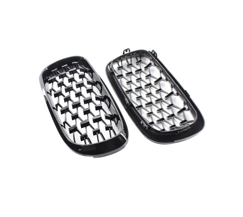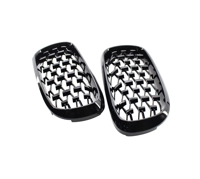 Par de grades dianteiras de carro em plástico preto brilhante com padrão de malha