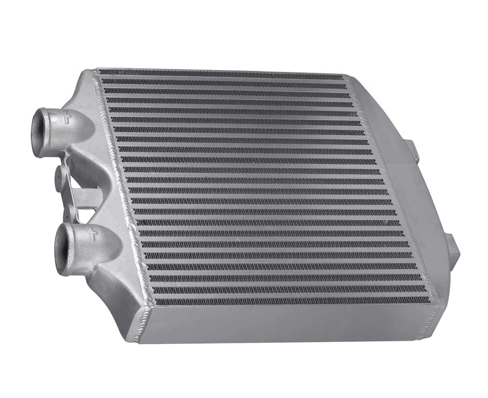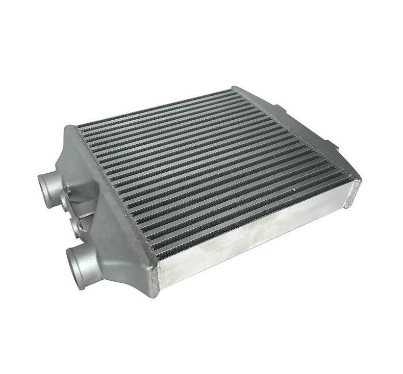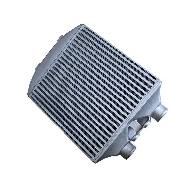Intercooler automóvel metálico com aletas paralelas e duas conexões cilíndricas