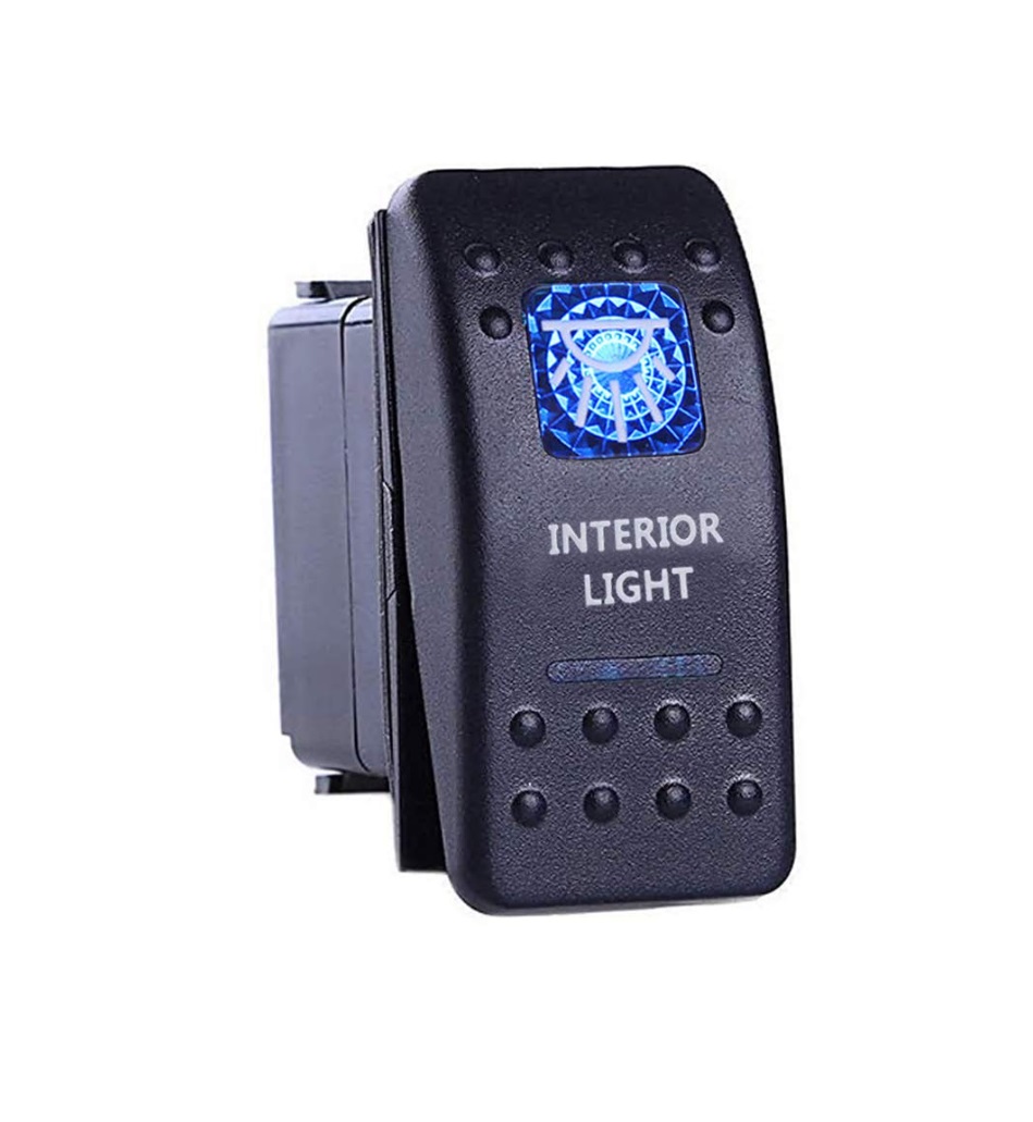 Interruptor elétrico preto com luz azul e texto INTERIOR LIGHT