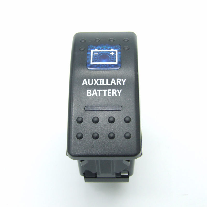 Interruptor para bateria auxiliar preto com texto branco e ícone azul