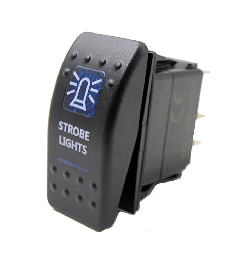 Interruptor preto com ícone azul e texto STROBE LIGHTS