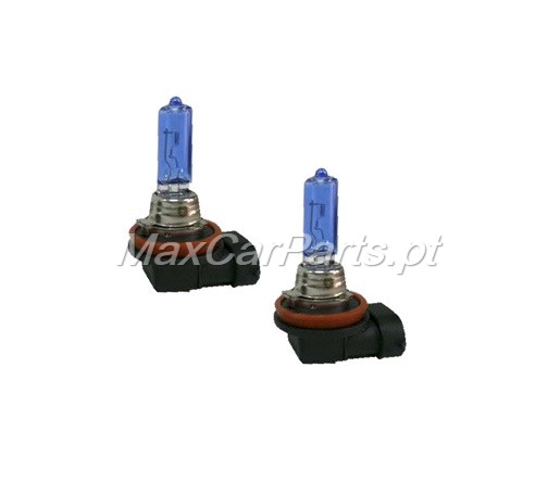 Par de lâmpadas de farol automóvel com bulbo azul e base preta