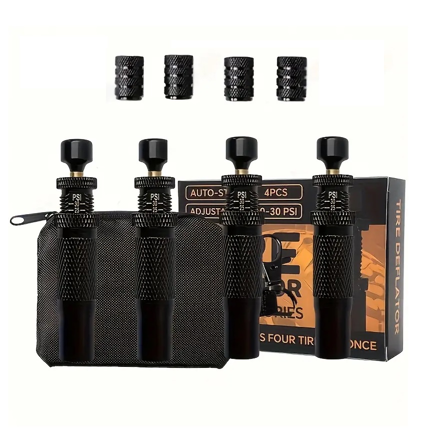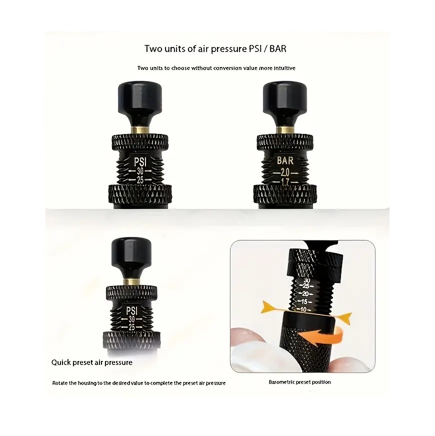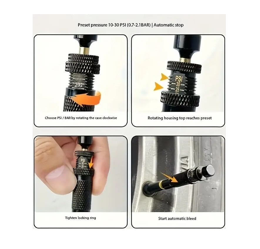 Não são necessárias ferramentas. Os esvaziadores de pneus tem uma escala clara, basta simplesmente girar o seu corpo e ajustar a pressão desejada e deixar libertar o ar. Faixa ajustável de 0,7 a 2.1 BAR, de 10 PSI a 30 PSI.