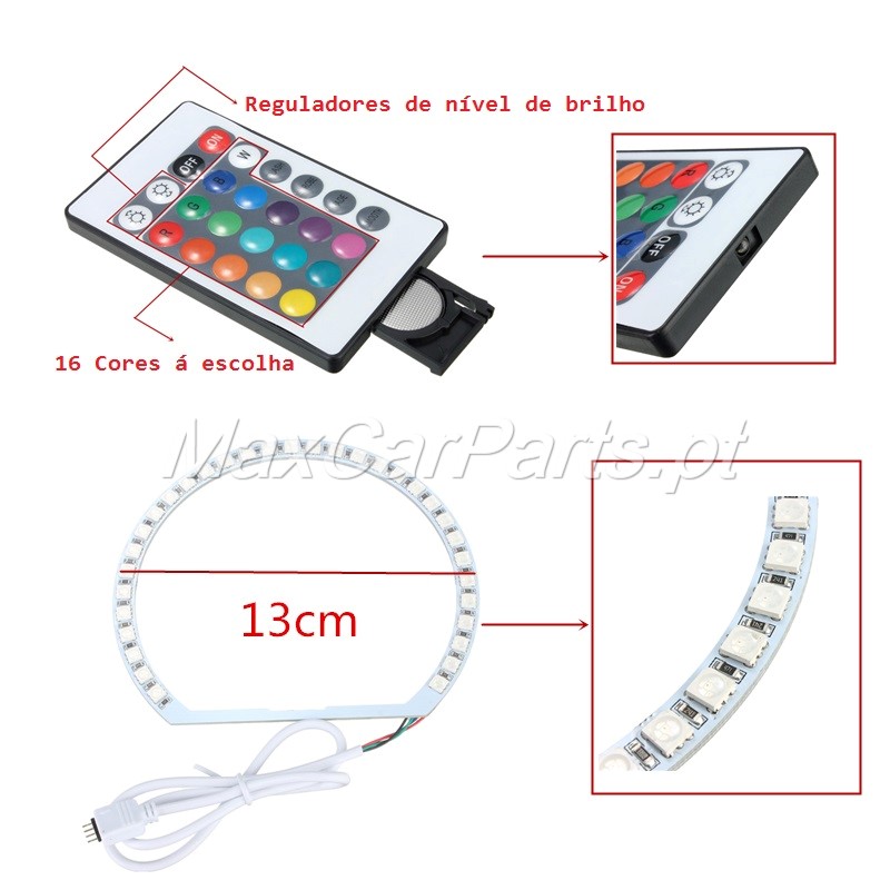 Cor iluminação de diversas cores, a seleção da cor é feita a qualquer momento via comando á distância.
