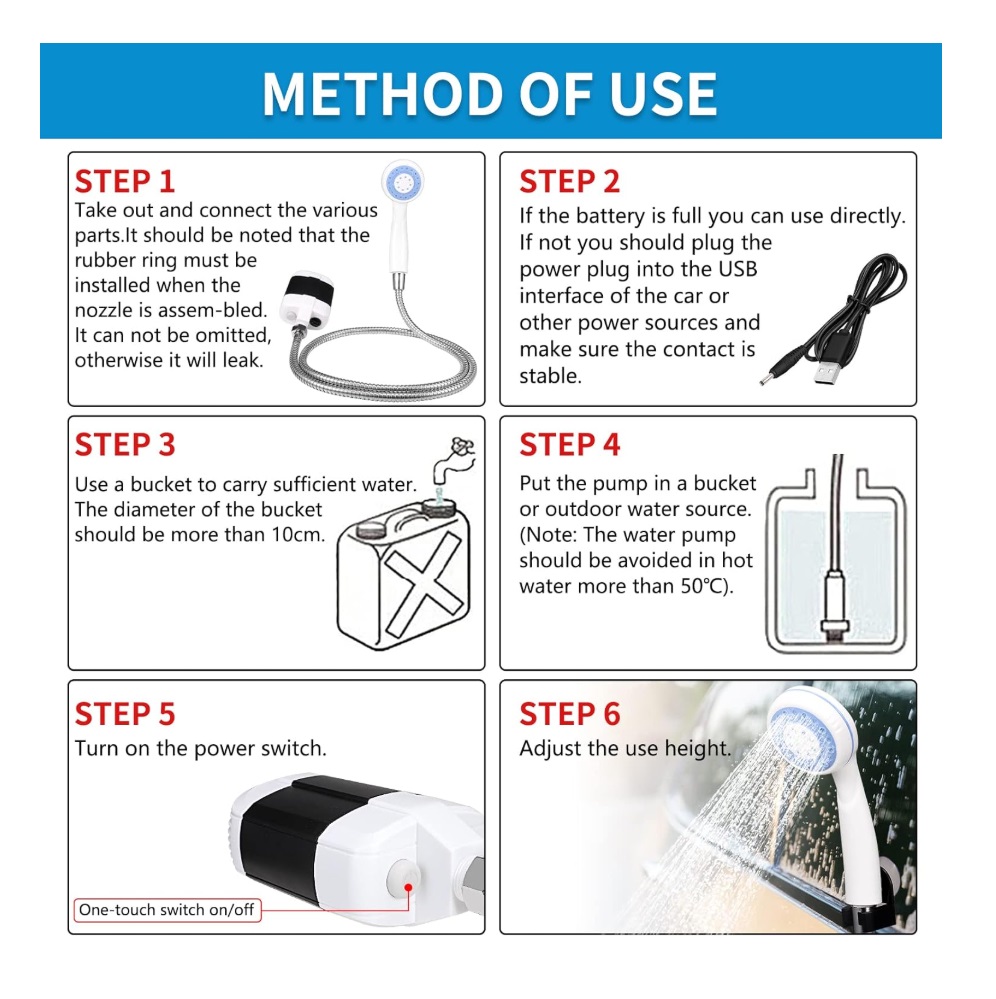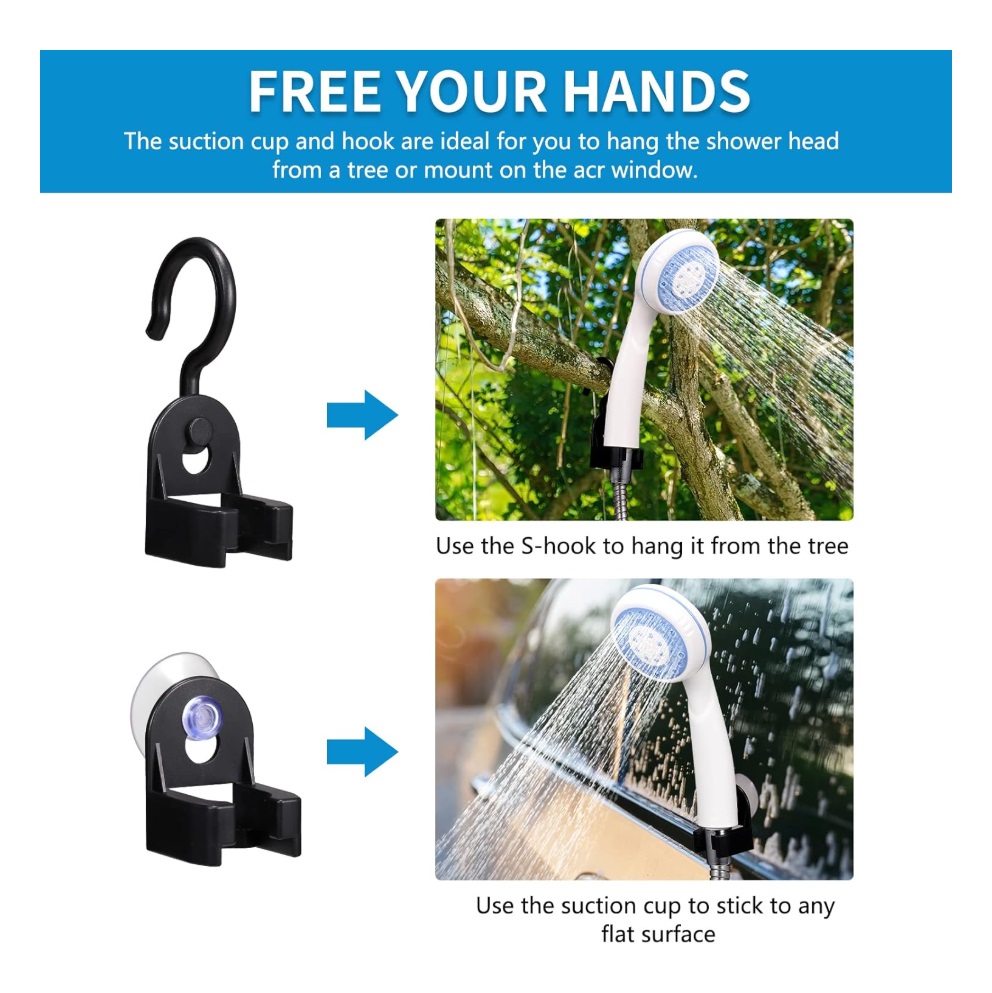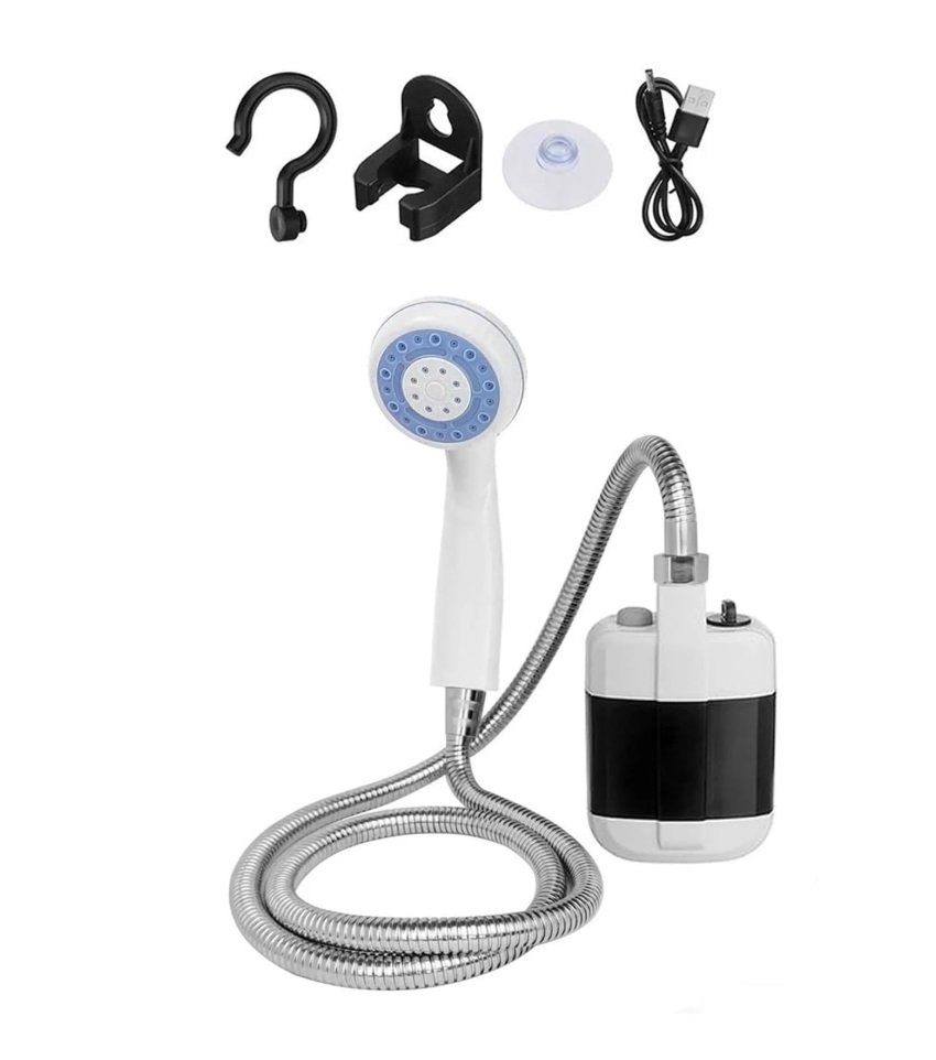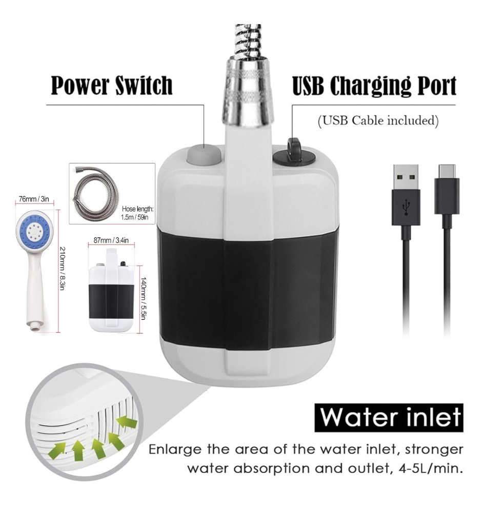 Chuveiro portátil leve e prático. Graças à bateria recarregável de íons de lítio e ao fácil carregamento via USB, pode desfrutar de um banho refrescante em qualquer lugar e a qualquer hora.