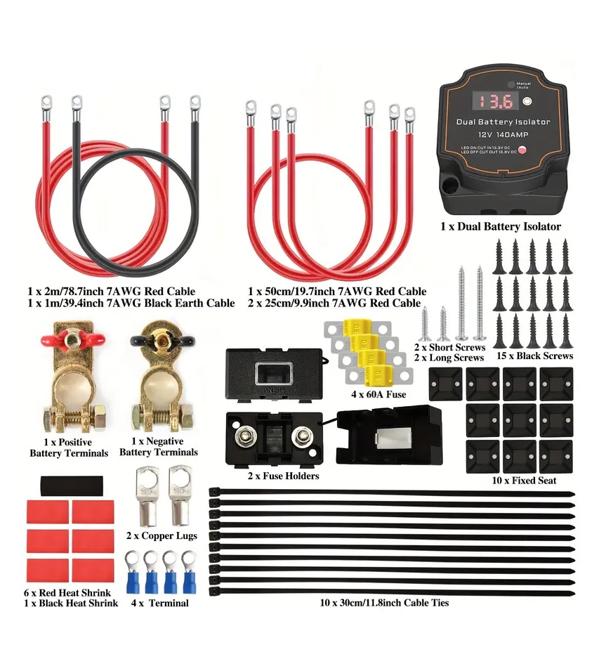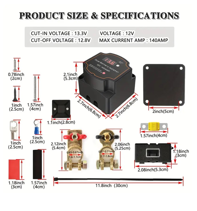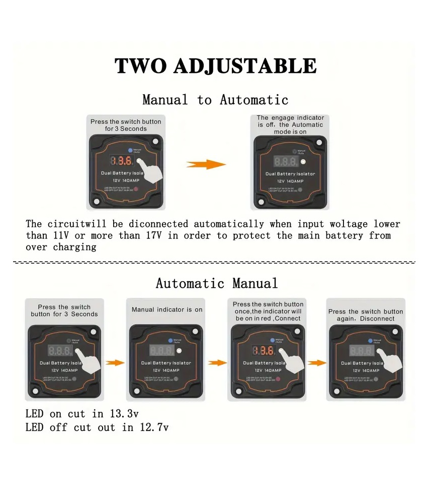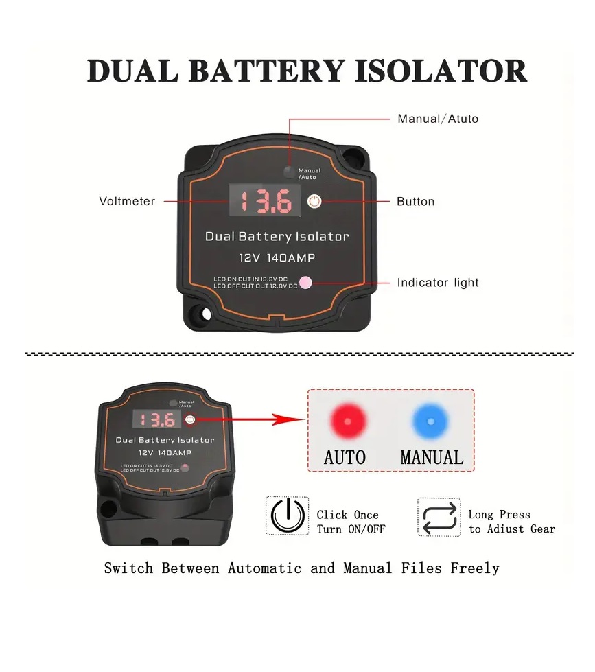 Visor do voltímetro: O isolador da bateria está equipada com um display LED para exibir o status da tensão atual. Se duas baterias estiverem conectadas, a tensão exibida no voltímetro é a bateria com maior tensão. Pressione o botão uma vez se o voltímetro não estiver funcionando e ele exibirá o valor por 3-5 segundos.