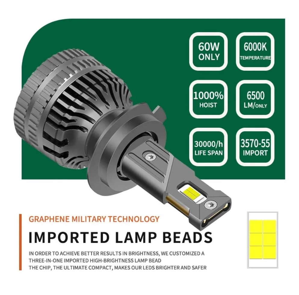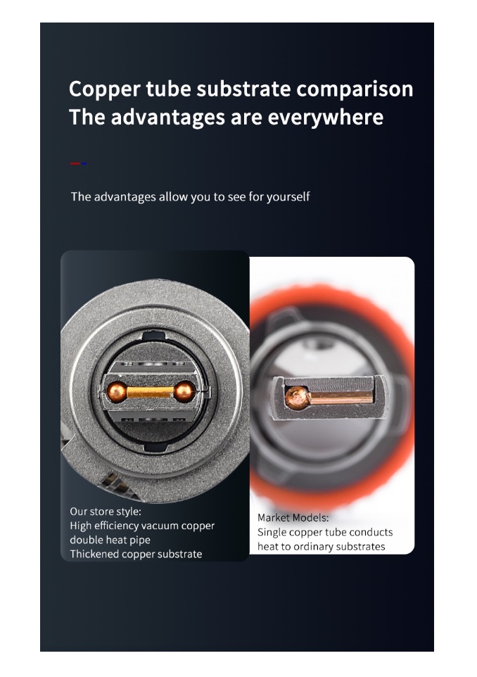 Design integrado com tubo de cobre a vácuo para resfriamento mais eficiente. O componente de cobre a vácuo (tubo de calor) esfria 200 vezes mais eficientemente do que o perfil de cobre padrão usado em lâmpadas de led para carros mais baratas.