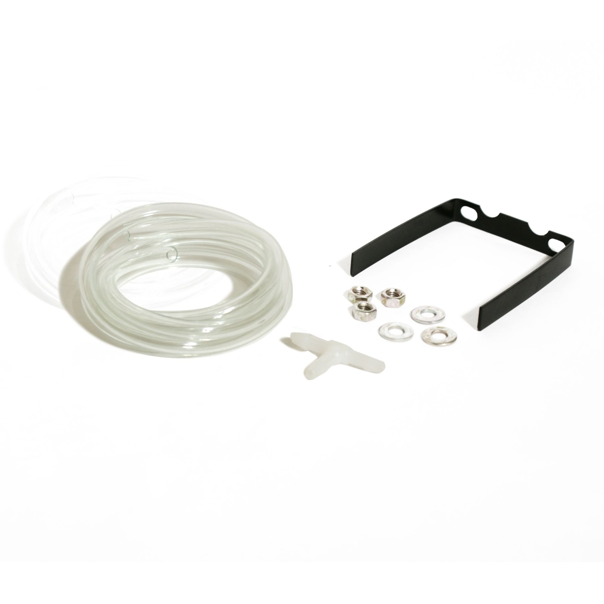 Conjunto de tubo transparente, peça em T branca, arruelas metálicas e estrutura metálica preta