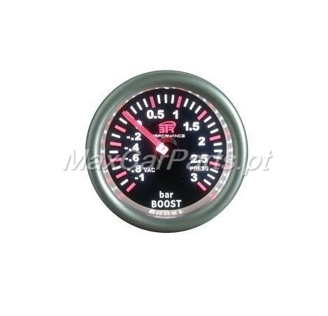 Medidor de pressão boost para automóveis, aro prateado, fundo preto, números brancos e vermelhos