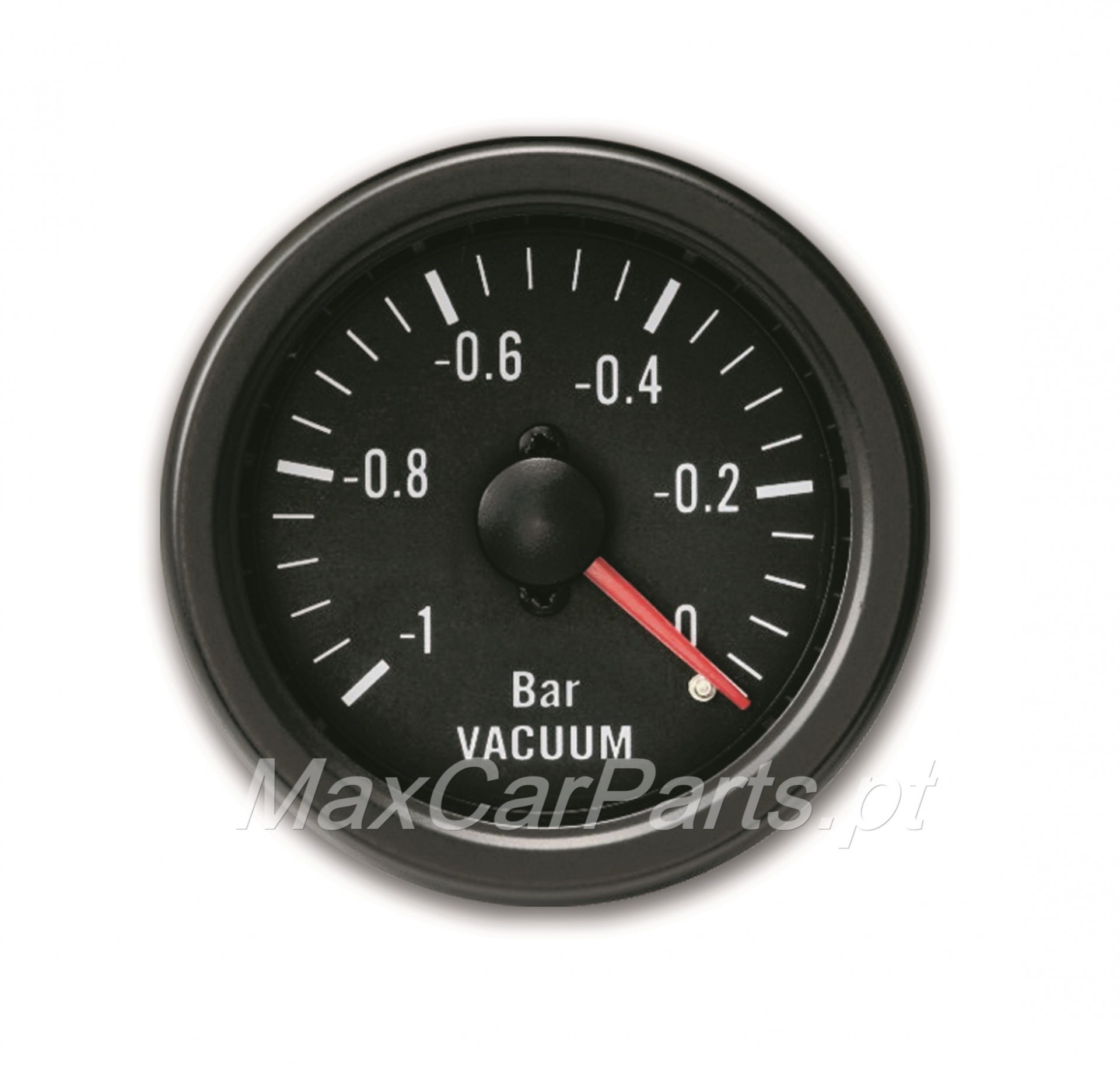 Manómetro preto redondo com escala de -1 a 0 Bar e ponteiro vermelho