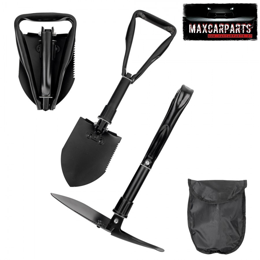 Ferramenta multifuncional preta com pá, picareta e bolsa