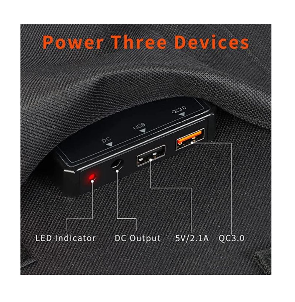 O painel solar inclui 1 x USB-A (65 W), 1 x USB-A (QC3.0 18 W) e 1 x ficha DC (18 V).