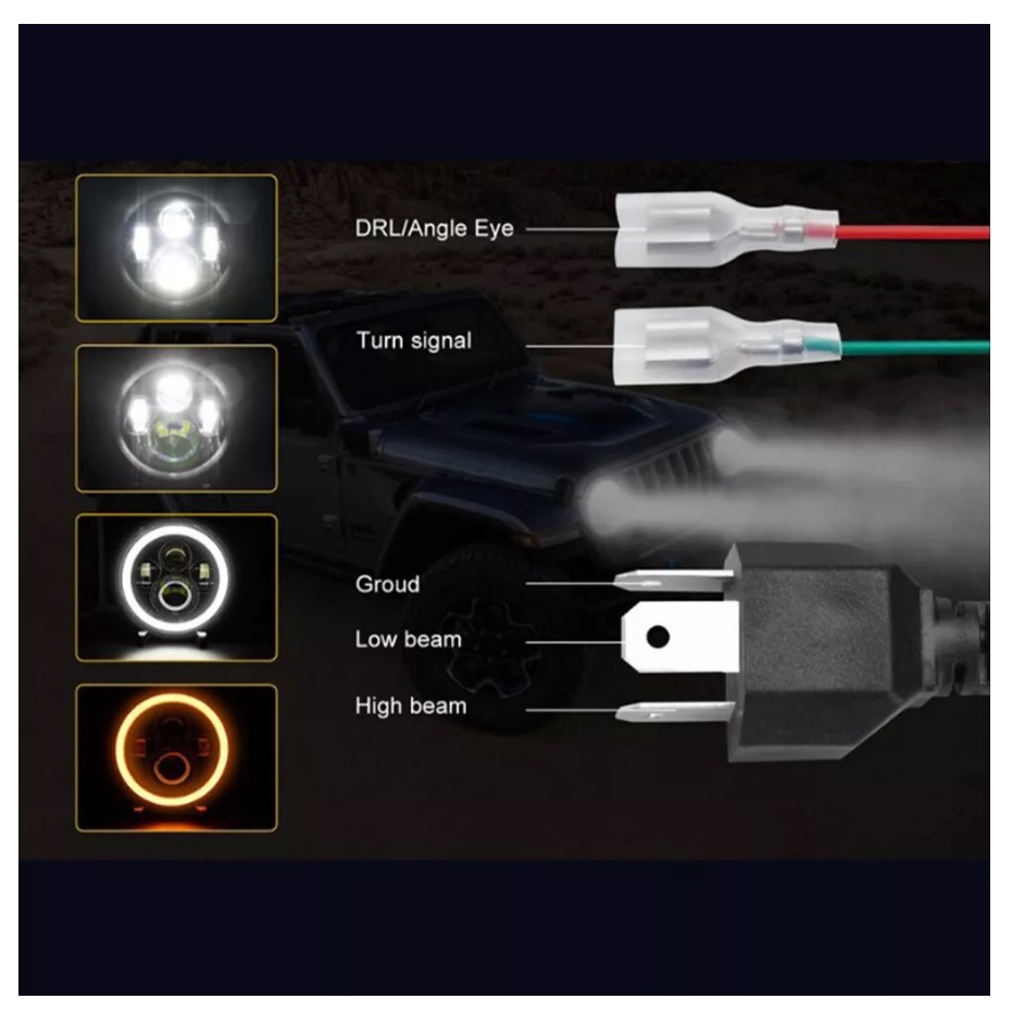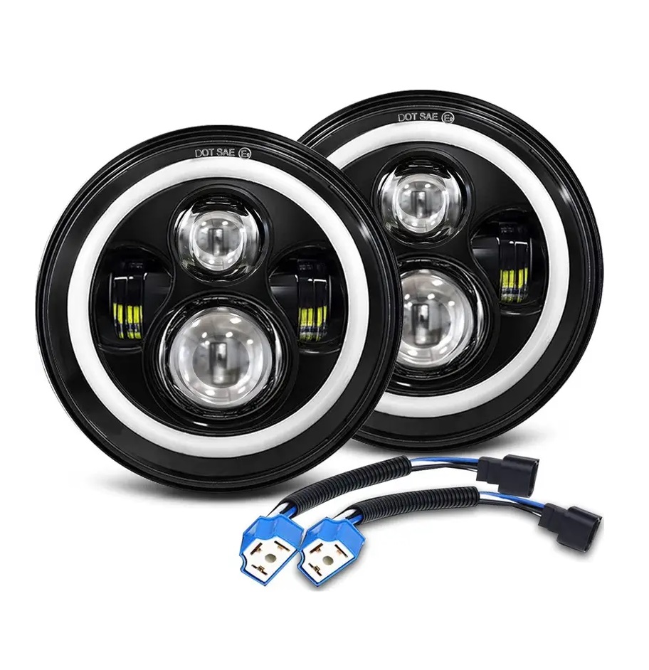 Par de Faróis LED com Angel Eyes de 100W (50W por farol), aproximadamente 12000lm e com 7 Polegadas de tamanho (178mm).