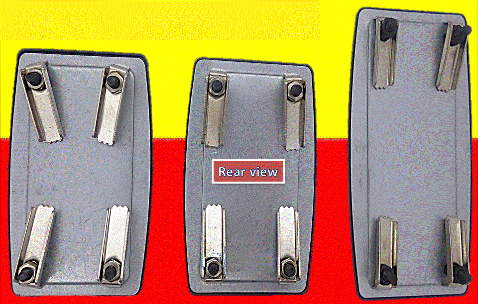 Três suportes metálicos retangulares com parafusos em fundo amarelo e vermelho