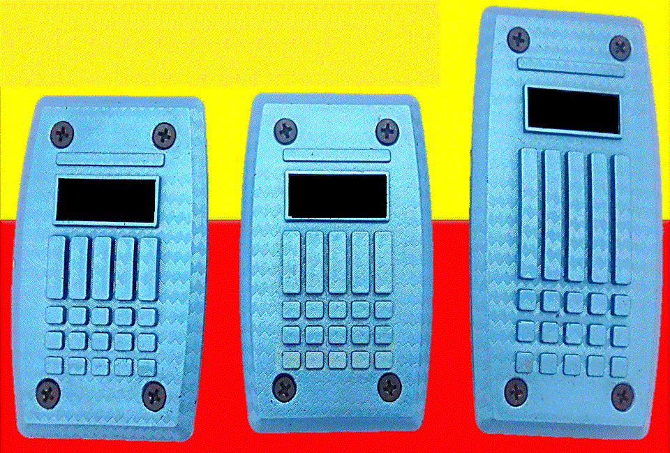Três calculadoras cinzentas com visor preto e botões em relevo em fundo amarelo/vermelho