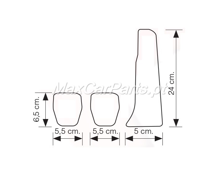 Conjunto de três pedais automóveis em metal prateado com inserções pretas