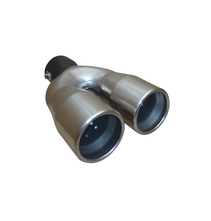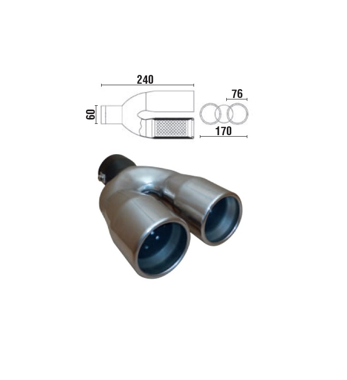 Extensão metálica de escape automóvel com dupla saída redonda e dimensões indicadas