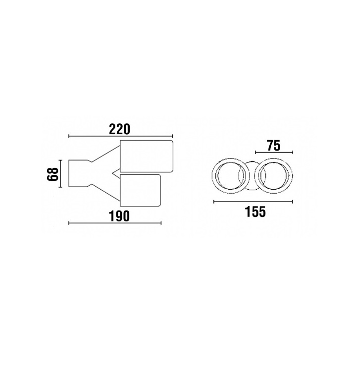 Desenho técnico preto e branco com medidas em milímetros de um dispositivo com duas saídas cilíndricas
