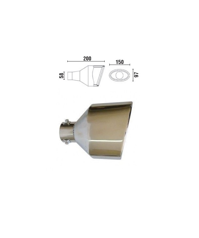 Ponteira de escape metálica cromada com medidas indicadas em desenho técnico.