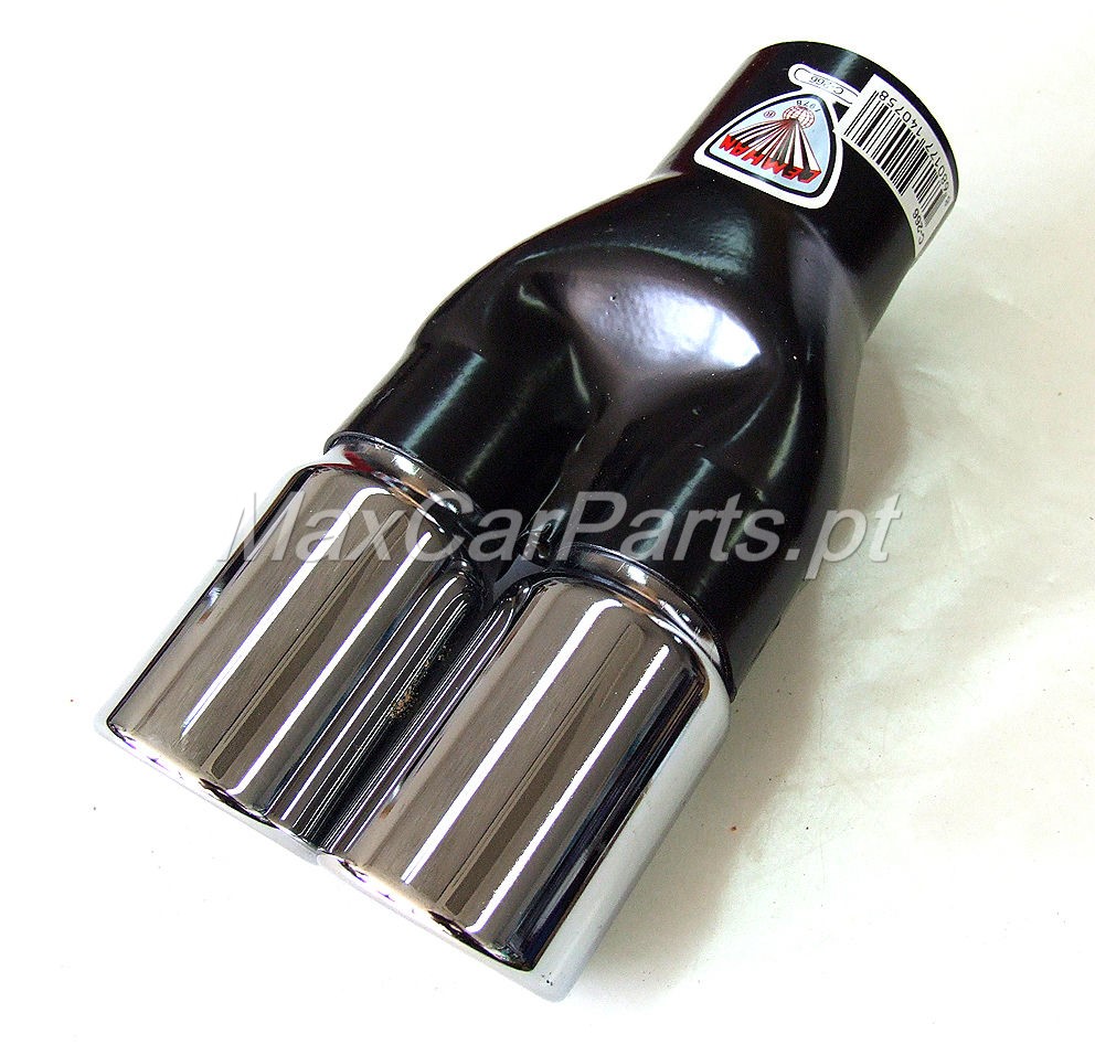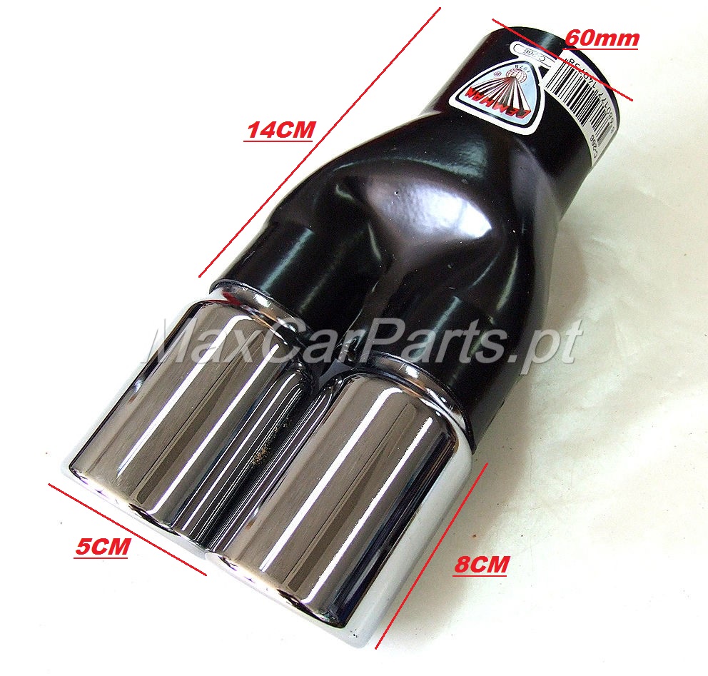 Ponteira dupla de escape automóvel cromada e preta com medidas indicadas