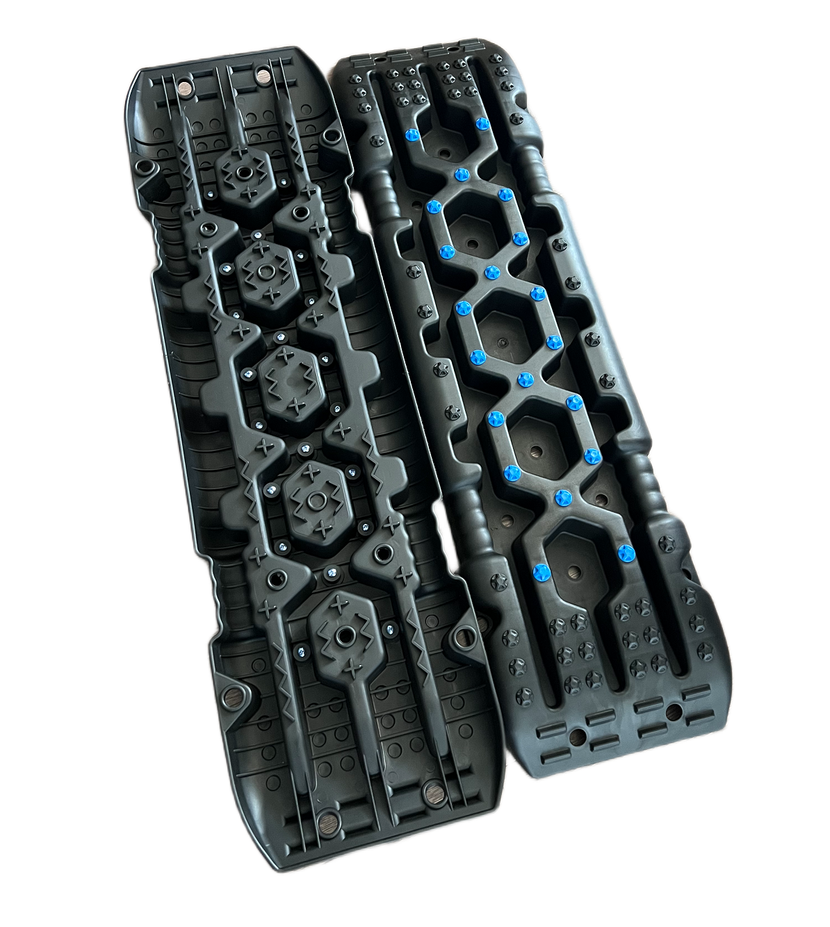 O conjunto/preço inclui duas pranchas de areia e lama feitas de polipropileno técnico de alta qualidade e de cor preta com acabamentos azuis.