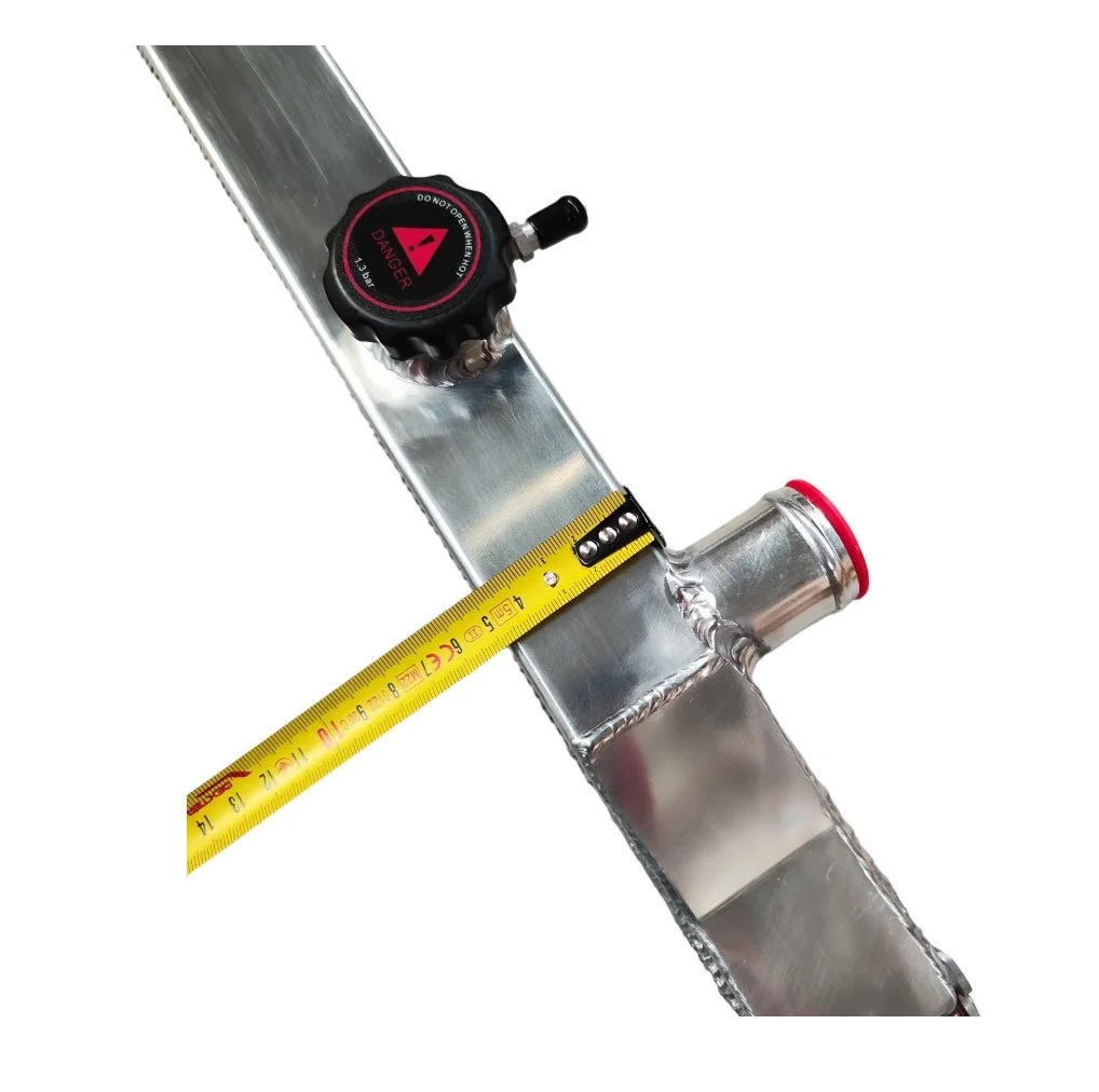 Radiador automóvel metálico prateado com tampas vermelhas e tampa preta