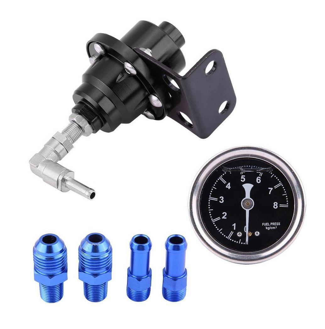 Conjunto regulador de pressão de combustível, manómetro e adaptadores metálicos azuis