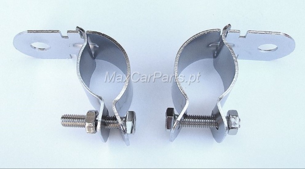 Par de grampos metálicos prateados com parafusos e porcas para fixação