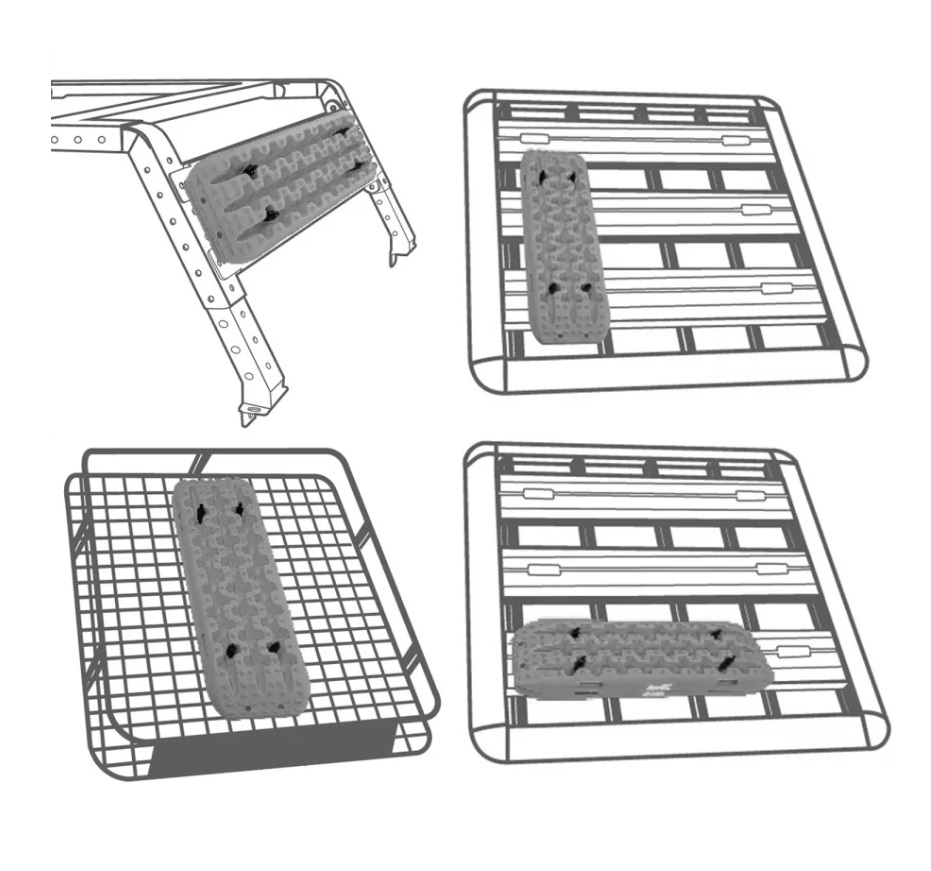 O design universal facilita a montagem em grades, barras, racks e plataformas de tejadilho sem ajustes complicados. Compatível com calhas deslizantes de plataforma de tejadilho, isto se tiver porcas de medida adequada ou um jogo de parafusos em T.