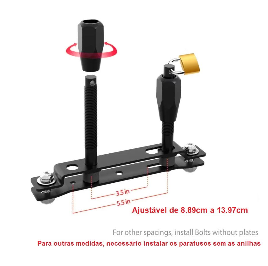 Suporte de aço grosso com revestimento em pó preto para maximizar a resistência à oxidação, com rosca e porcas de alumínio. O kit também inclui arruelas planas, porcas e revestimentos de silicone para apoiar e reduzir as vibrações sobre a fixação.