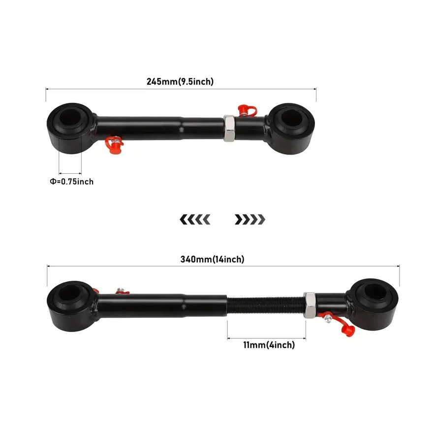 Os tirantes desconectáveis permitem uma maneira rápida e fácil de desconectar para aumentar a articulação do eixo da frente. Permitem também, o ajuste para diferentes alturas de elevação e fácil ajuste do ângulo da barra. O pino de encaixe facilita a desconexão e reconexão da barra fácilmente e sem ferramentas necessárias.