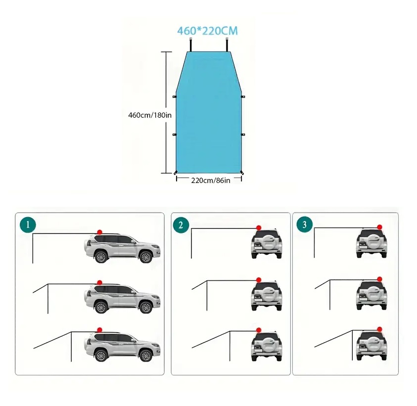 Gama económica de Toldos de tejadilho - Versão portátil sem necessidade de rack de tejadilho ou calhas de fixação na viatura e podendo ser guardada na mala da viatura.