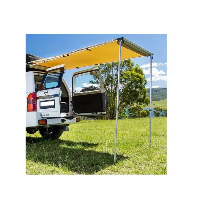 Toldo rebatível com estrutura de fixação com 1.4 metros de largura por 2 metros de comprimento em abertura, normalmente poderá ser utilizado na traseira ou lateral da viatura.