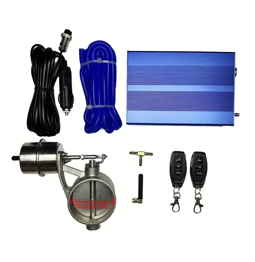 Válvula bypass de controlo por vácuo para os gases de escape, com 76 milímetros de diâmetro, permitem com um apertar de botão, a passagem de uma linha de escape com panelas para uma linha directa, passando de um trabalhar silencioso para um mais desportivo.