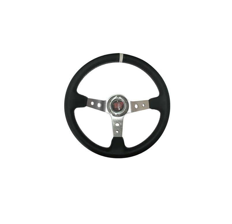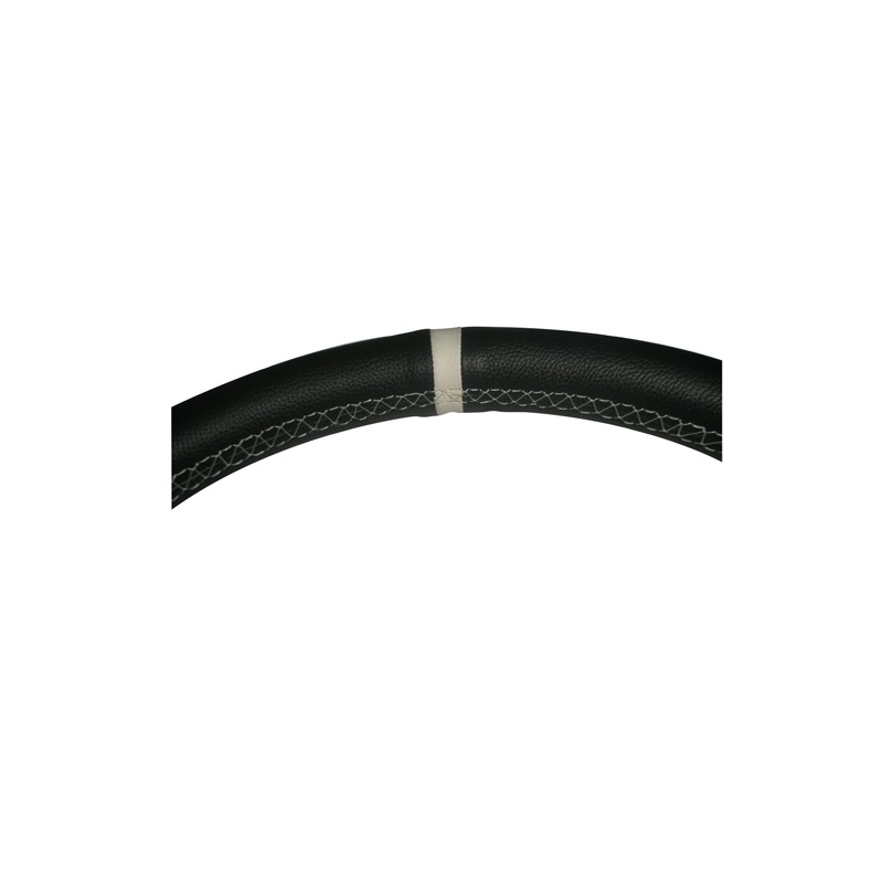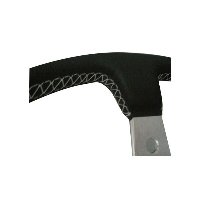 Volante de 350mm universal, feito em aluminio e em Pele, costuras brancas, risca branca e centro em cinza escovado.