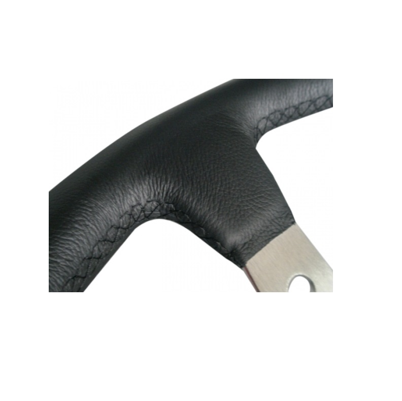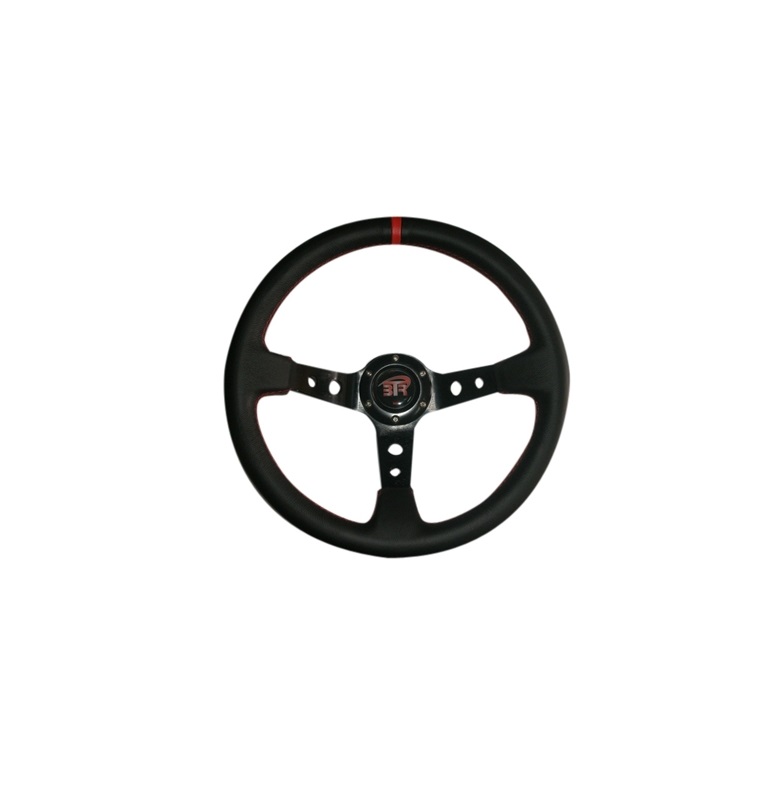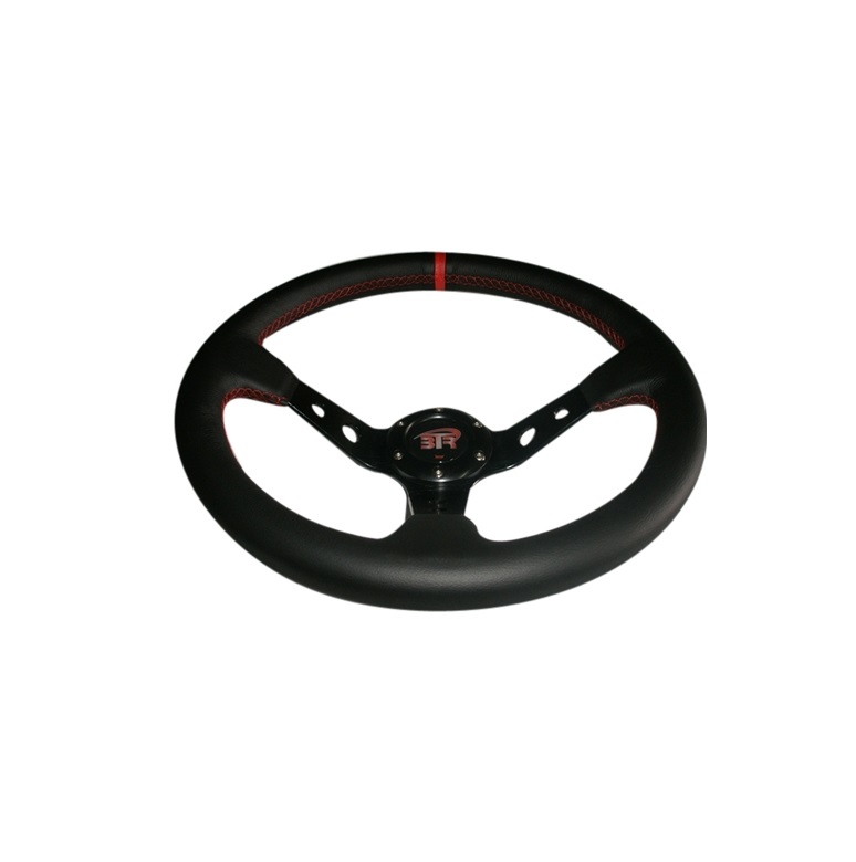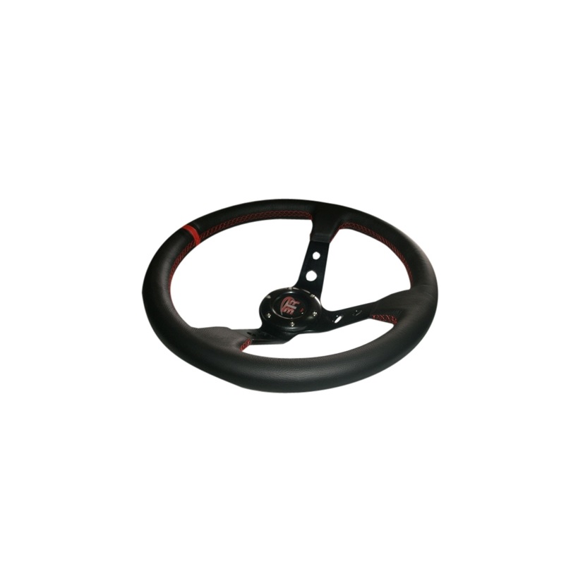 Volante de 350mm universal, feito em aluminio e em Pele, costuras vermelhas, risca vermelha e centro em preto.
